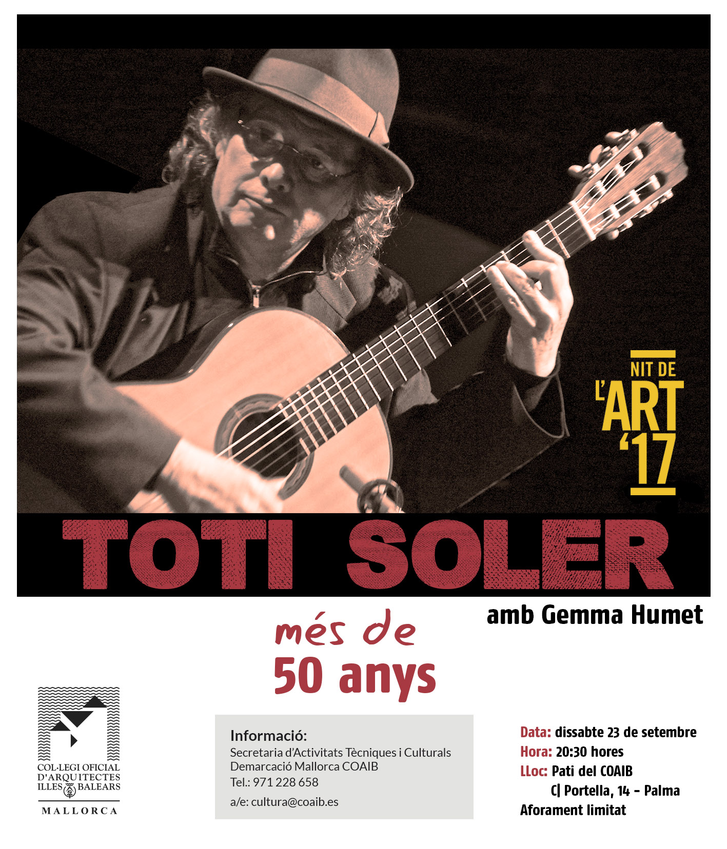 “Música i poesia, dues formes d'art germanes que juntes creixen i germinen. Dues veus unides cap a l'emoció. Així toca i canta Toti Soler acompanyat de la deliciosa veu de Gemma Humet. Un captivador recorregut pel seu exquisit univers de guitarra i cançó: tan mediterrani, tan contemporani, tan universal; a través dels millors temes que ha escrit durant els més de cinquanta anys de dedicació a la guitarra i a la composició amb la seva forma personal sensible i profunda de compondre, interpretar i posar veu als poetes”.