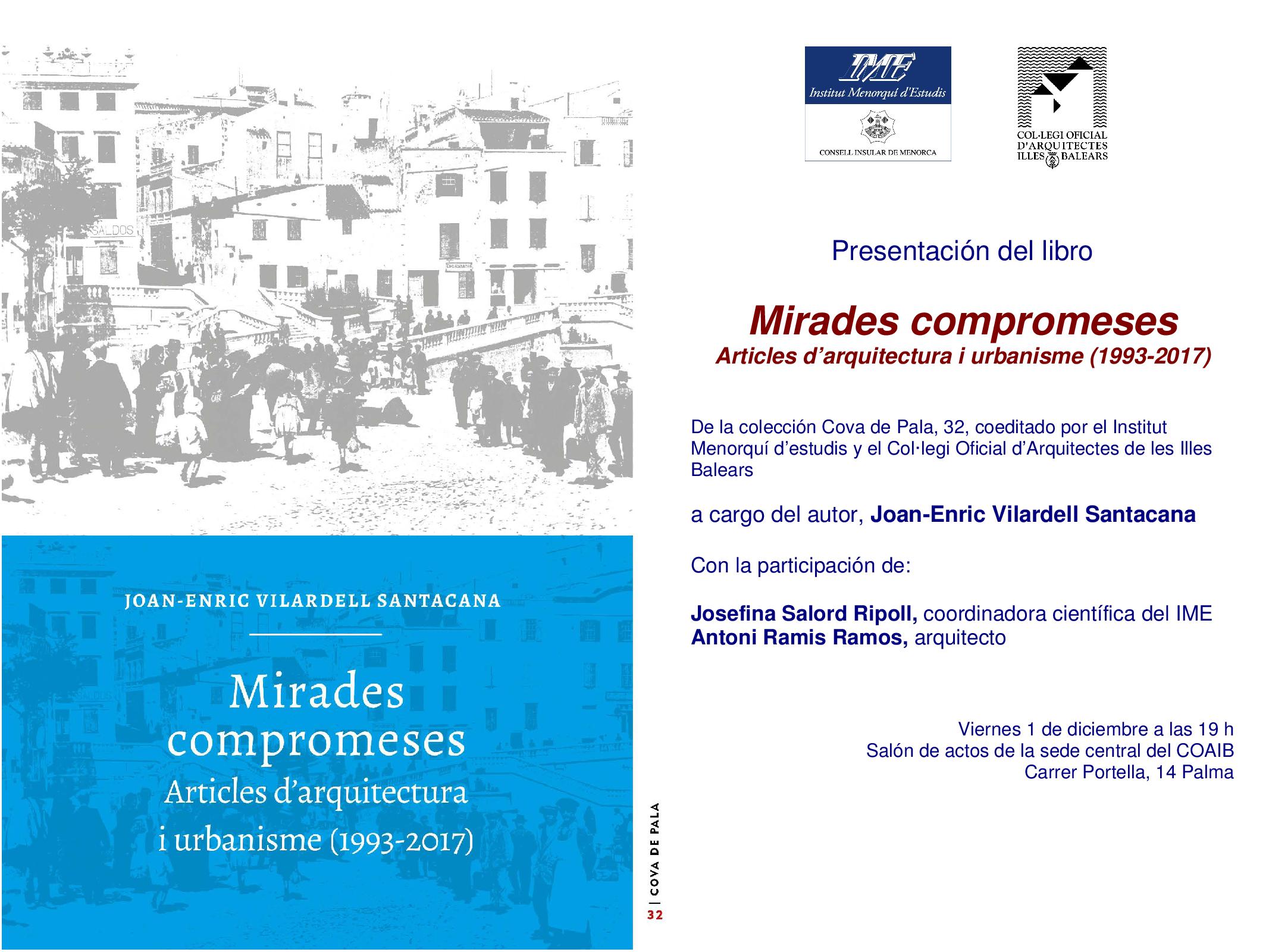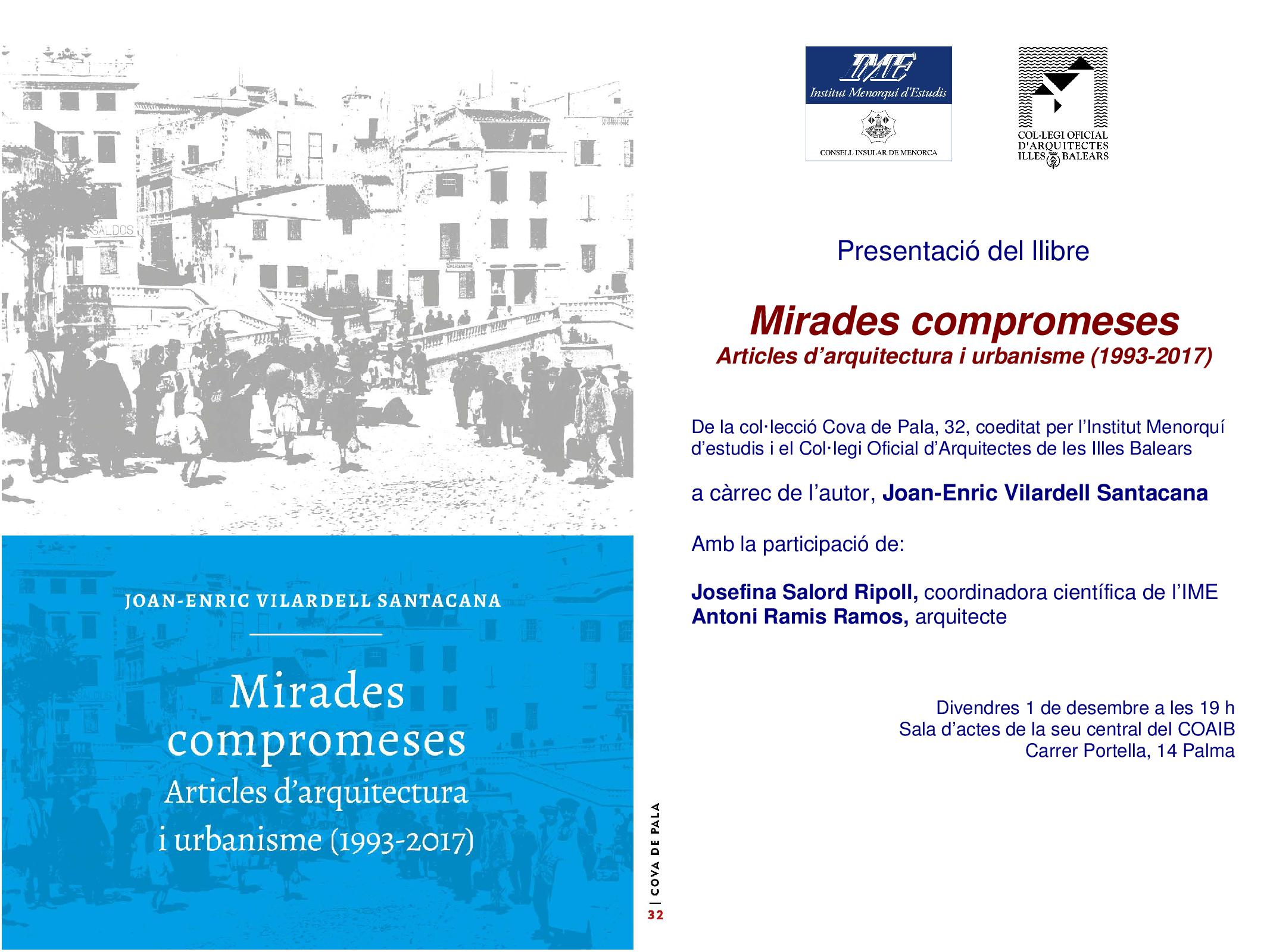 L’arquitecte JoanEnric Vilardell Santacana presenta el seu llibre Mirades Compromeses, Articles d’arquitectura i urbanisme (1993-2017), de la col·lecció Cova de Pala, 32, coeditat per l’Institut Menorquí d’estudis i el Col·legi Oficial d’Arquitectes de les Illes Balears.