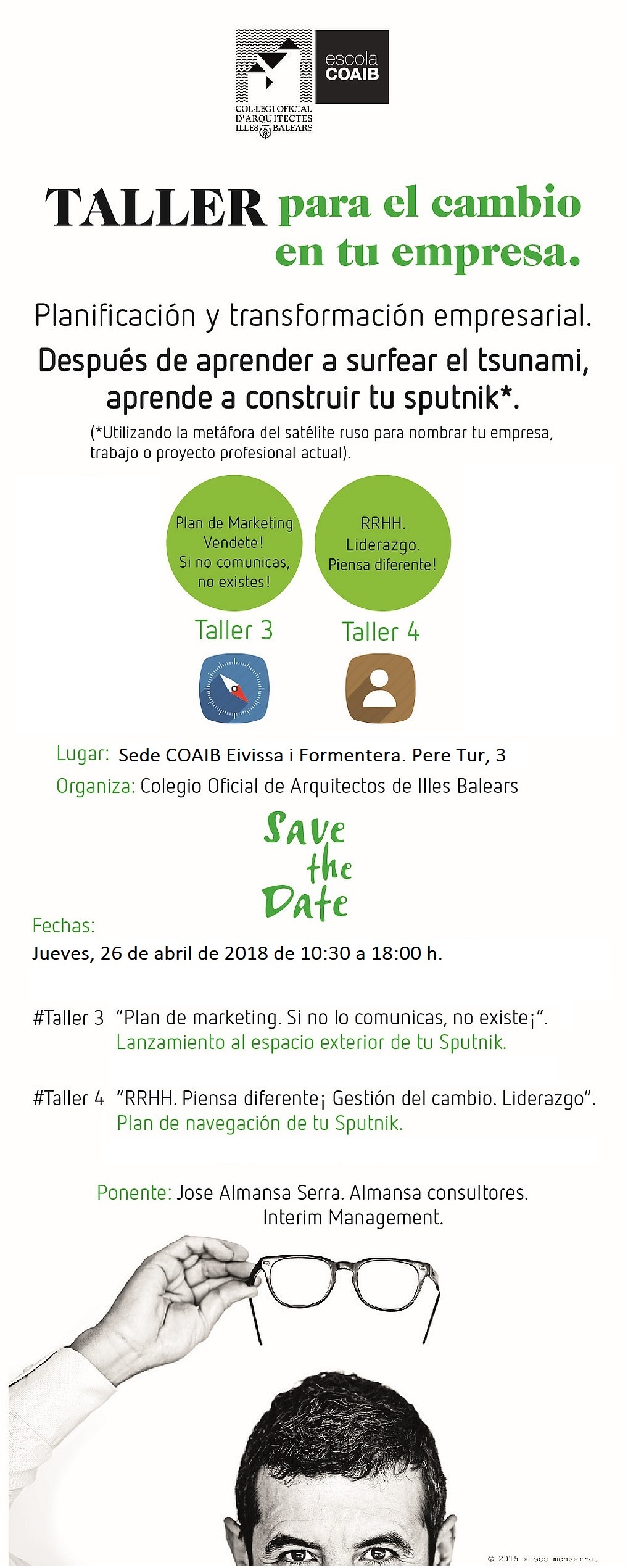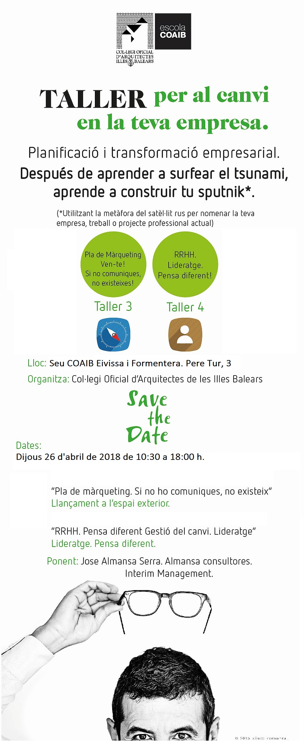 Curs Perfil Empresarial. Taller per al canvi a la teva empresa. Planificació i transformació empresarial. Aprèn a surfejar el tsunami i a construir el teu sputnik*. COAIB Eivissa, 26 d’abril de 2018.AJORNAT.