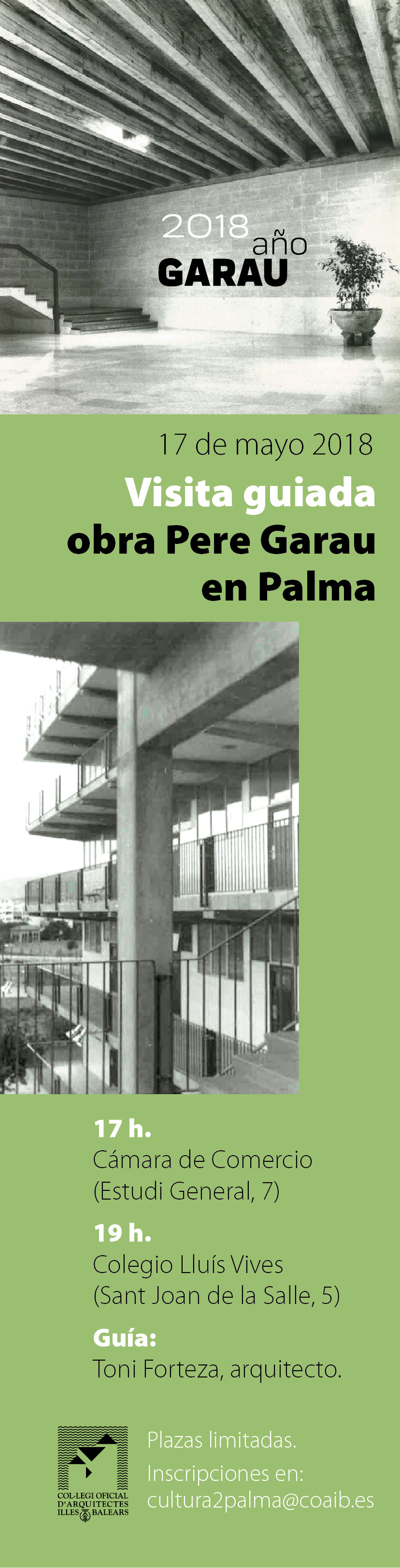 La Demarcació Mallorca del COAIB organitza, en el marc de l’any Garau, una visita guiada a les obres més representatives de l’arquitecte Pere Garau dins Palma: la Cambra de Comerç i el Col·legi Lluís Vives.