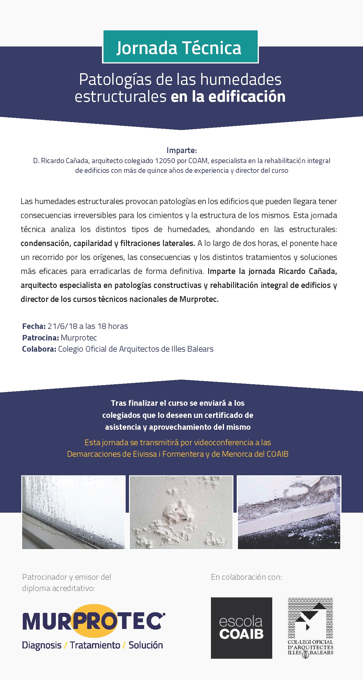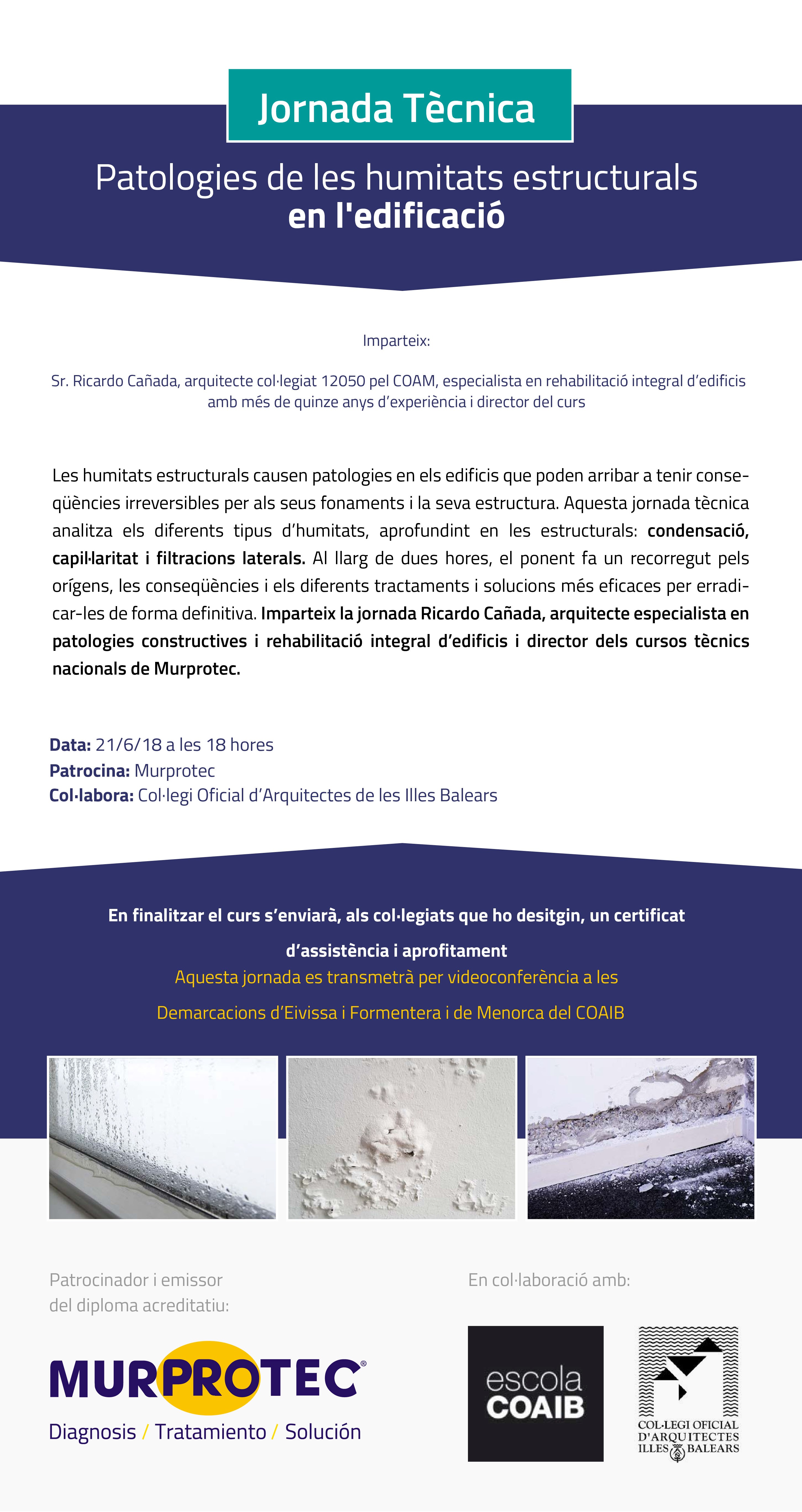 L'empresa MURPROTEC organitza, amb la col·laboració de l'Escola COAIB, la jornada tècnica Patologies de les humitats estructurals en l'edificació, que se celebrarà el 21 de juny, de 18:00 a 20:00h, a la sala d'actes de la seu central del COAIB (carrer Portella, 14 – Palma) i amb transmissió per videoconferència a les Demarcacions d'Eivissa i Formentera i de Menorca del COAIB.
