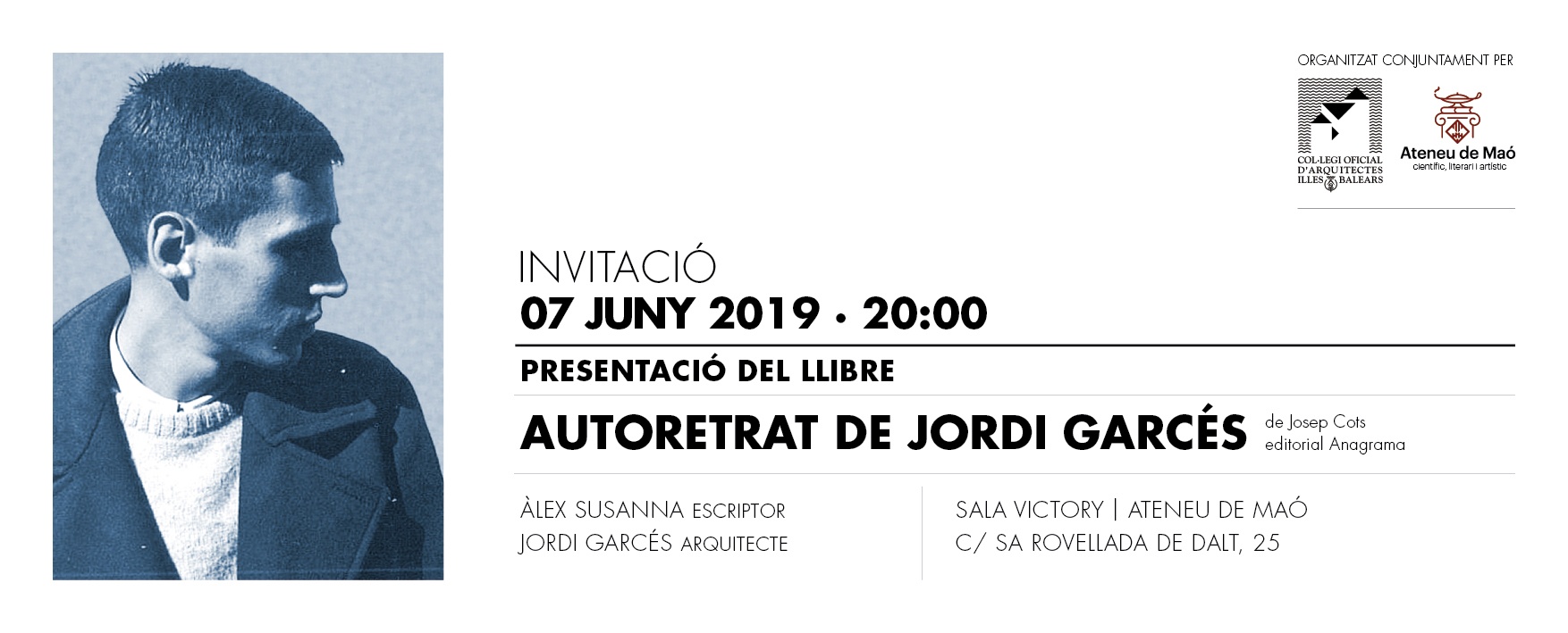 Presentació del llibre “Autoretrat de Jordi Garcés” a càrrec d’Alex Susanna, escriptor i Jordi Garcés, arquitecte. Maó, 07/06/19