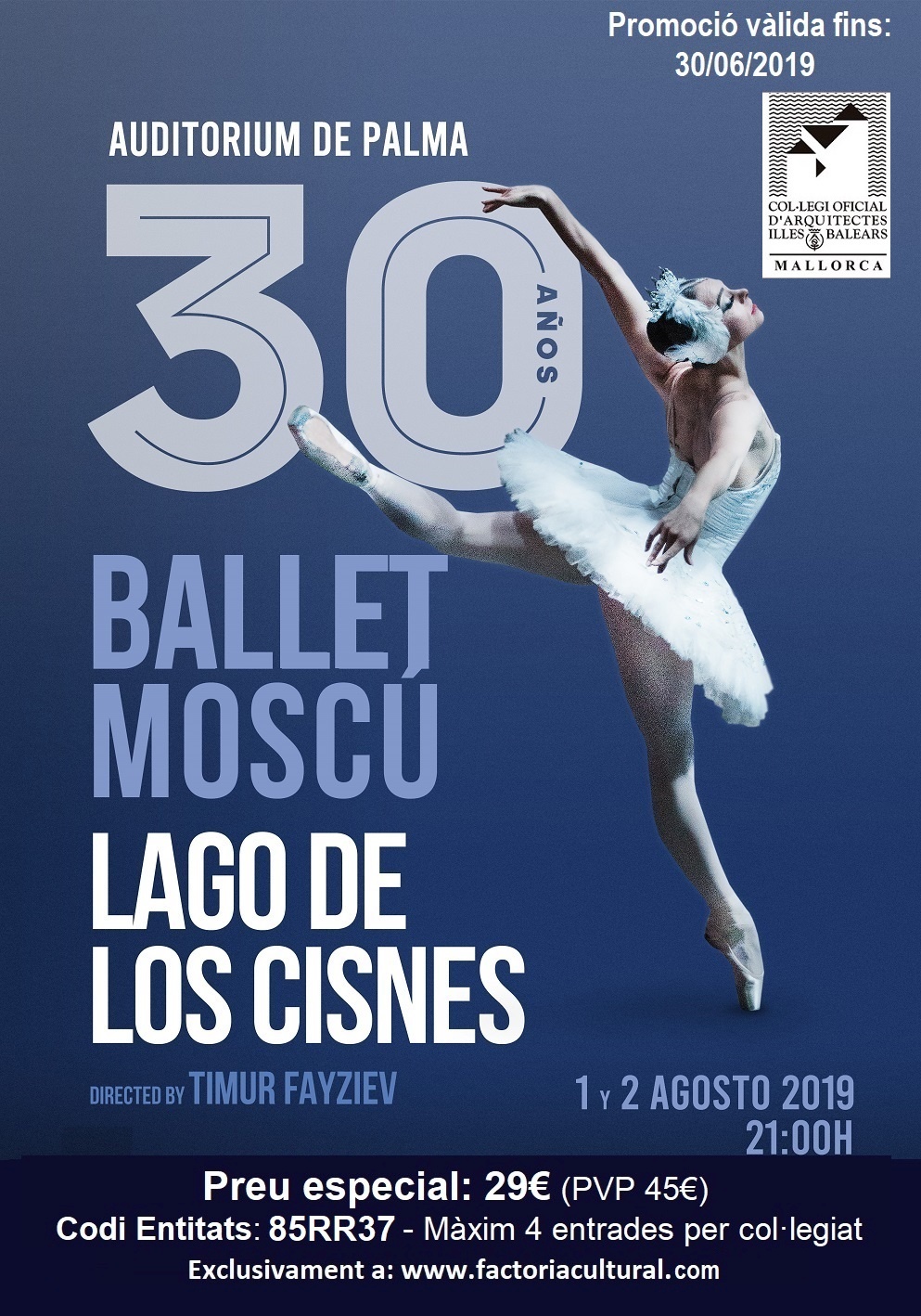 El Ballet de Moscou torna a Palma de Mallorca els dies 1 i 2 d’agost, a les 21 hores i, com en edicions anteriors, ens ofereixen un descompte pels col·legiats, vàlid fins al 30 de juny. La compra d’entrades s’haurà de fer a través de web, seleccionant el nombre d’entrades a l’apartat “Entitats” i afegint el codi de promoció 85RR37. El preu de les entrades és de 45 € i amb el descompte promocional surt a 29 €, amb un màxim de 4 entrades per col·legiat.
