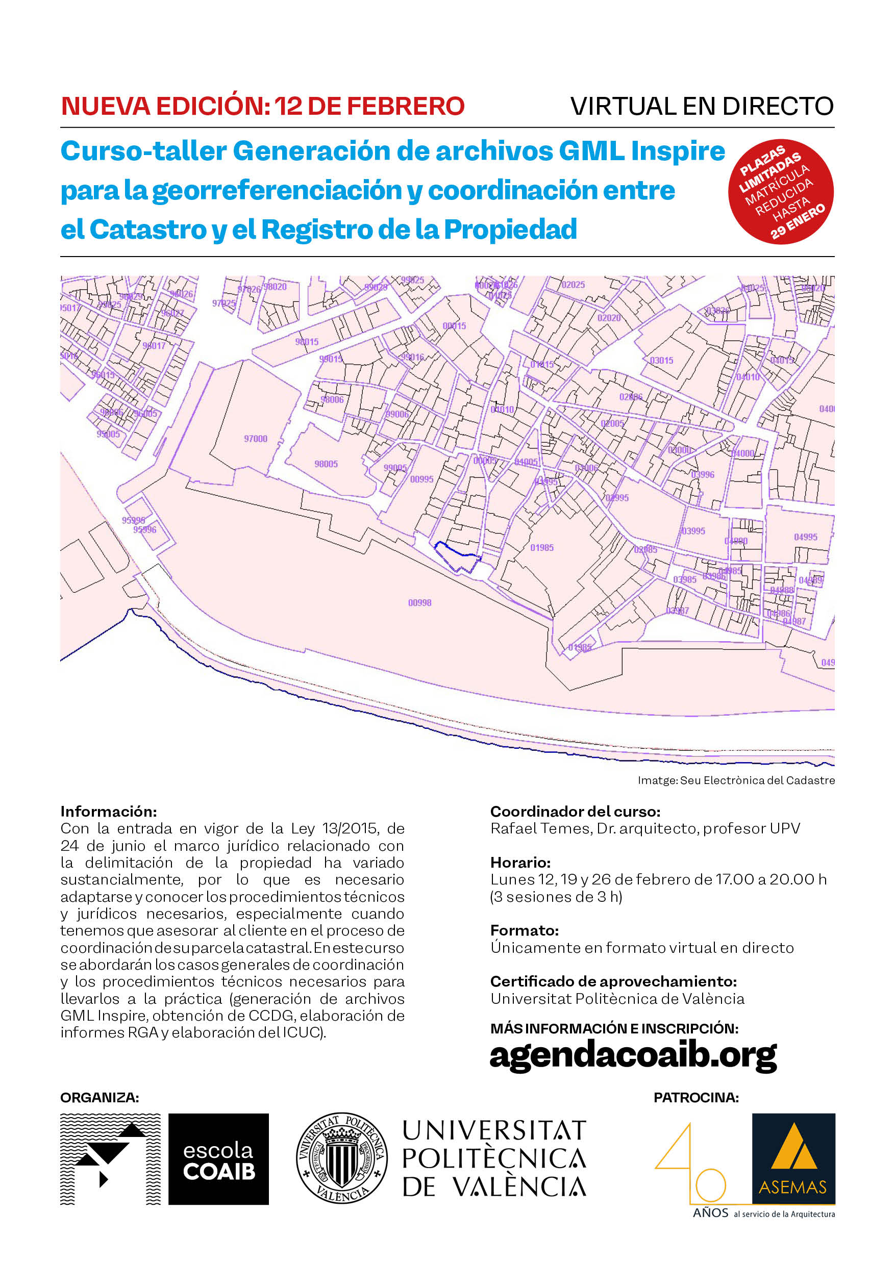 Us informem que, amb la 1a i la 2a edició completes, hem obert el període d'inscripció d'una nova edició del Curs-taller Generació d’arxius GML Inspire per a la georeferenciació i coordinació entre el Cadastre i el Registre de la Propietat, coorganitzat per l'Escola COAIB i la Universitat Politècnica de València (UPV), i patrocinat per Asemas, que s'impartirà dilluns 4, dilluns 11 i dimarts 12 de març de 17.00 a 20.00 h en format virtual en directe.