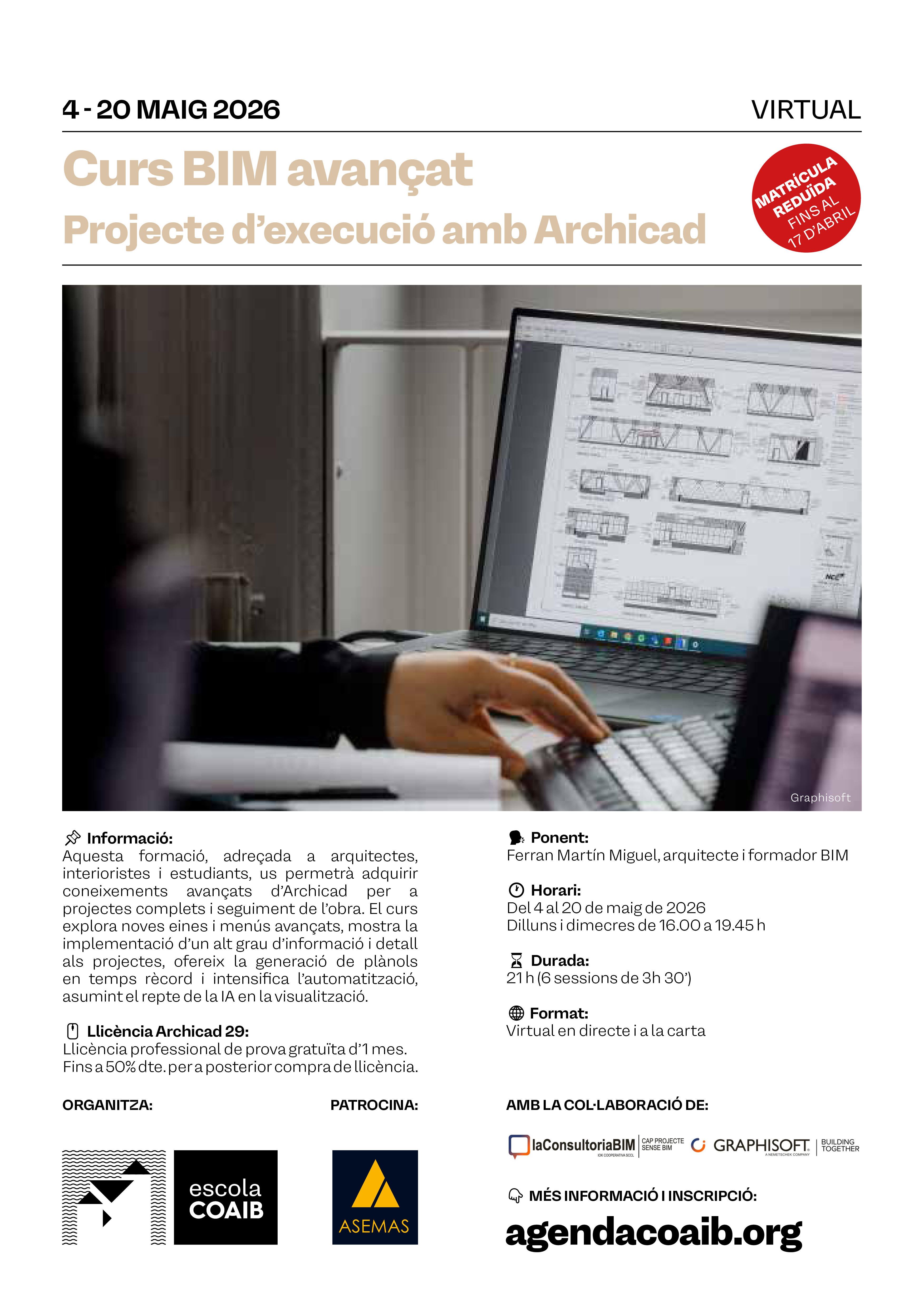 Curs BIM avançat / Projecte d'execució amb Archicad. Del 4 al 20 de maig de 2026.