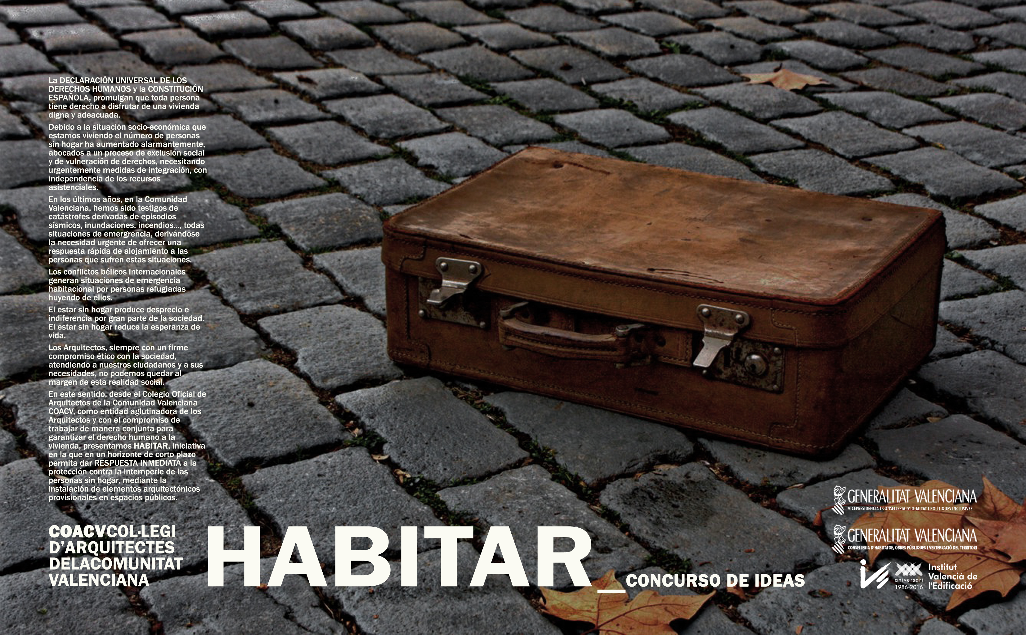Objecte: L'objecte del present concurs d'idees, és la selecció per part del Jurat, de la millor solució arquitectònica, que permeti una resposta immediata a la protecció contra la intempèrie de les persones sense llar, mitjançant la instal·lació d'elements provisionals en espais públics.