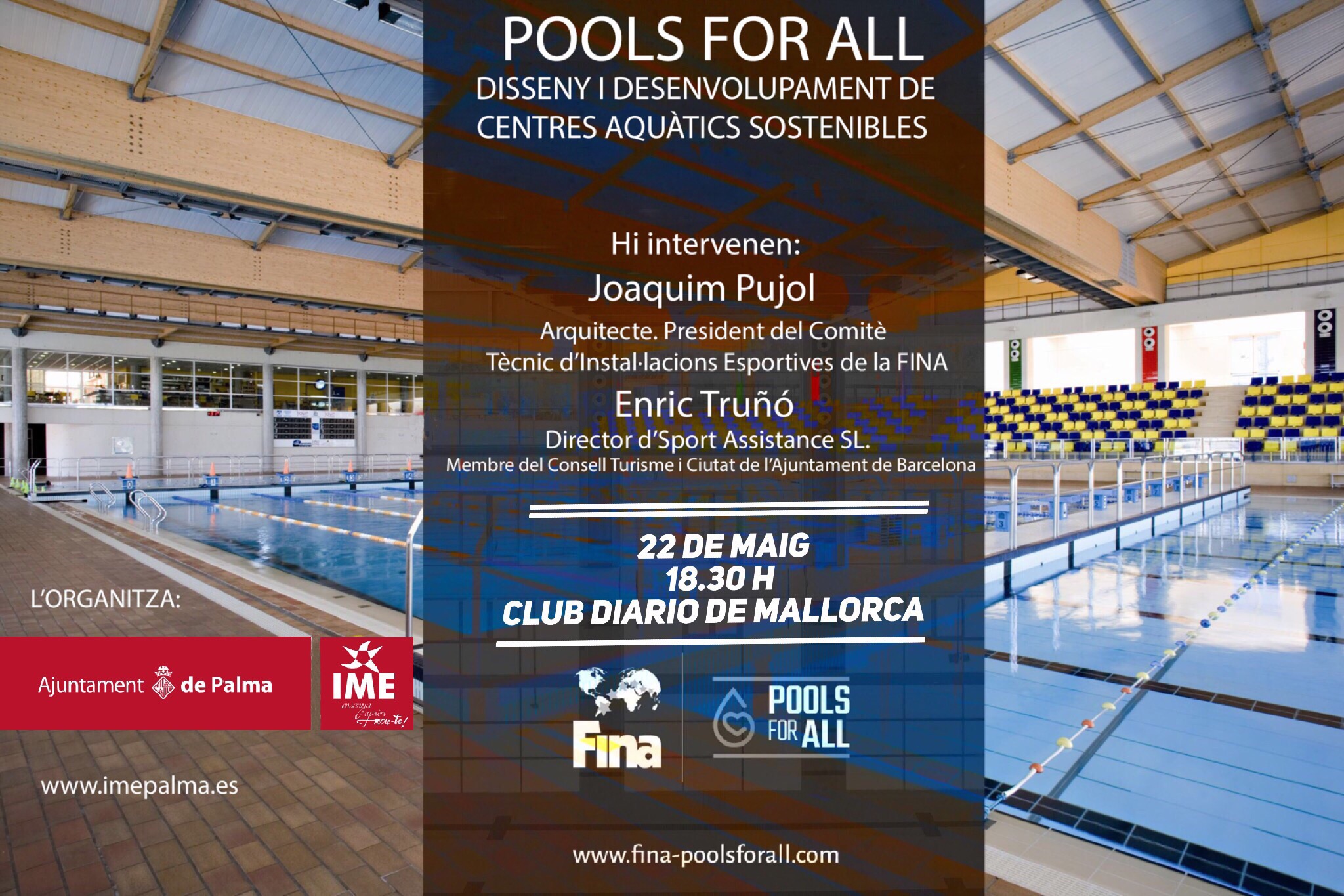 L’Institut Municipal de l’Esport, de l'Ajuntament de Palma, ha organitzat una jornada en relació al disseny i el desenvolupament de centres aquàtics sostenibles, que tindrà lloc al Club Diario de Mallorca el proper dia 22 de maig. La conferència, que anirà a càrrec de l’arquitecte Quim Pujol i d’Enric Truñó, pretén fer una mirada al futur amb una aposta per la innovació, la sostenibilitat i l’eficiència de recursos als centres aquàtics.