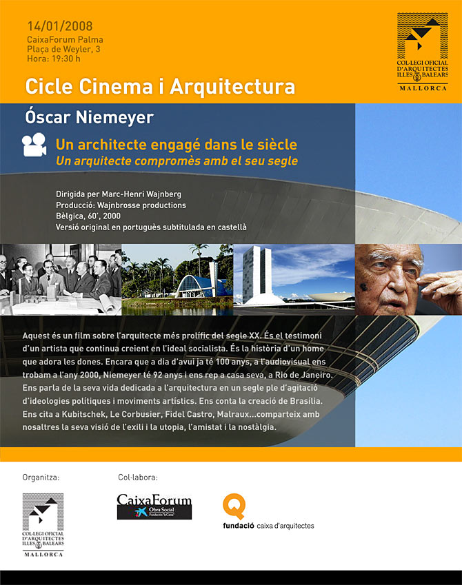 La Demarcació Mallorca del COAIB organitza la projecció del documental «Óscar Niemeyer un arquitecte compromès amb el seu segle» (Oscar Niemeyer un architecte engagé dans le siècle) que es realitzarà el pròxim dilluns, dia 14 de gener de 2008, a les 19:30 h., al CaixaFòrum de Palma. La projecció d’aquest documental és possible gràcies a la cessió de drets adquirits per la Fundació Caixa d’Arquitectes mitjançant el finançament obtingut del Fons d’Educació i Promoció de la Caixa d’Arquitectes.