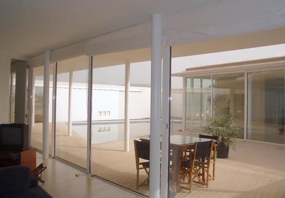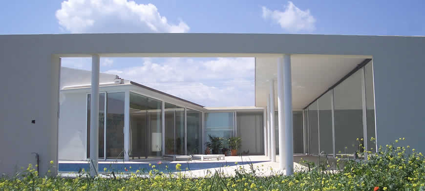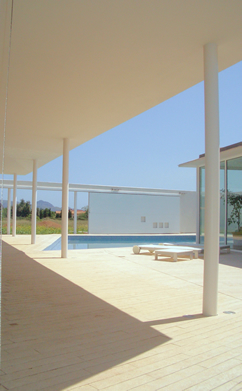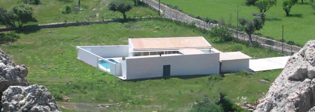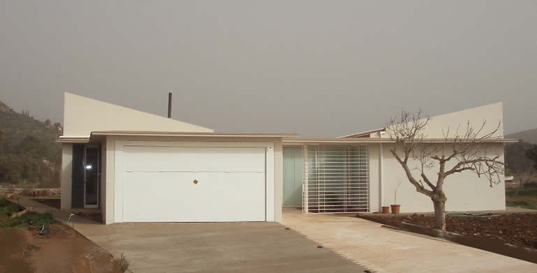 Situada en una “parcel·lació rústica”, aquesta vivenda pateix l'inconvenient de la proximitat de la carretera Pollença-Port i d'altres amb motiu a edificacions properes, pel que s'opta, envers la consecució de la privacitat desitjada, per una àrea quasi tancada pels murs perimetrals de façana i els de tancament del pati, que s'obriran discrecionalment. Així, ambdós cossos (en què la configuració dels plànols inclinats de coberta obeeixen a imposicions de la Normativa Urbanística) més els murs de tancament del pati conformaran l'àrea contenidora de la piscina, terrassa coberta i descoberta contigües a les parts totalment vidriades i constituiran referents propers de totes les dependències.