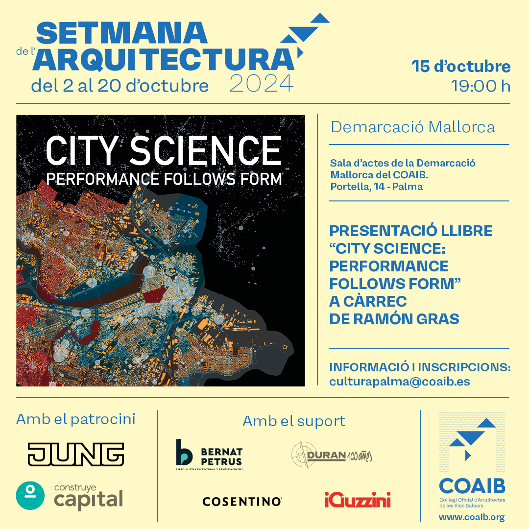 El pròxim dimarts 15 d'octubre a les 19:00 h, el Col·legi Oficial d'Arquitectes de les Illes Balears (COAIB) acollirà la presentació del llibre "City Science: Performance Follows Form", a càrrec del seu autor, Ramon Gras. L'acte tindrà lloc a la Sala d'Actes de la Demarcació Mallorca del COAIB, situada al carrer Portella, 14, Palma.