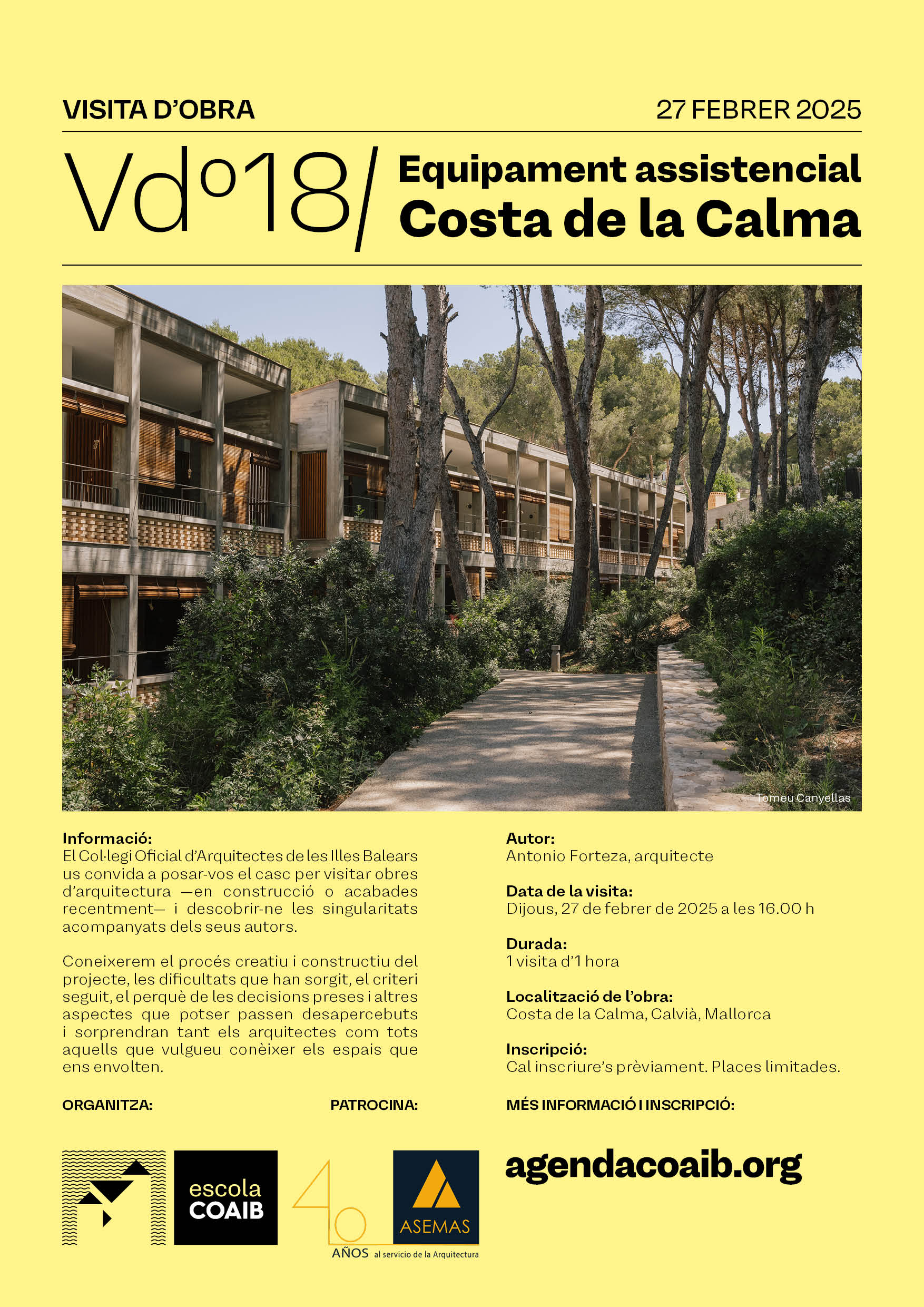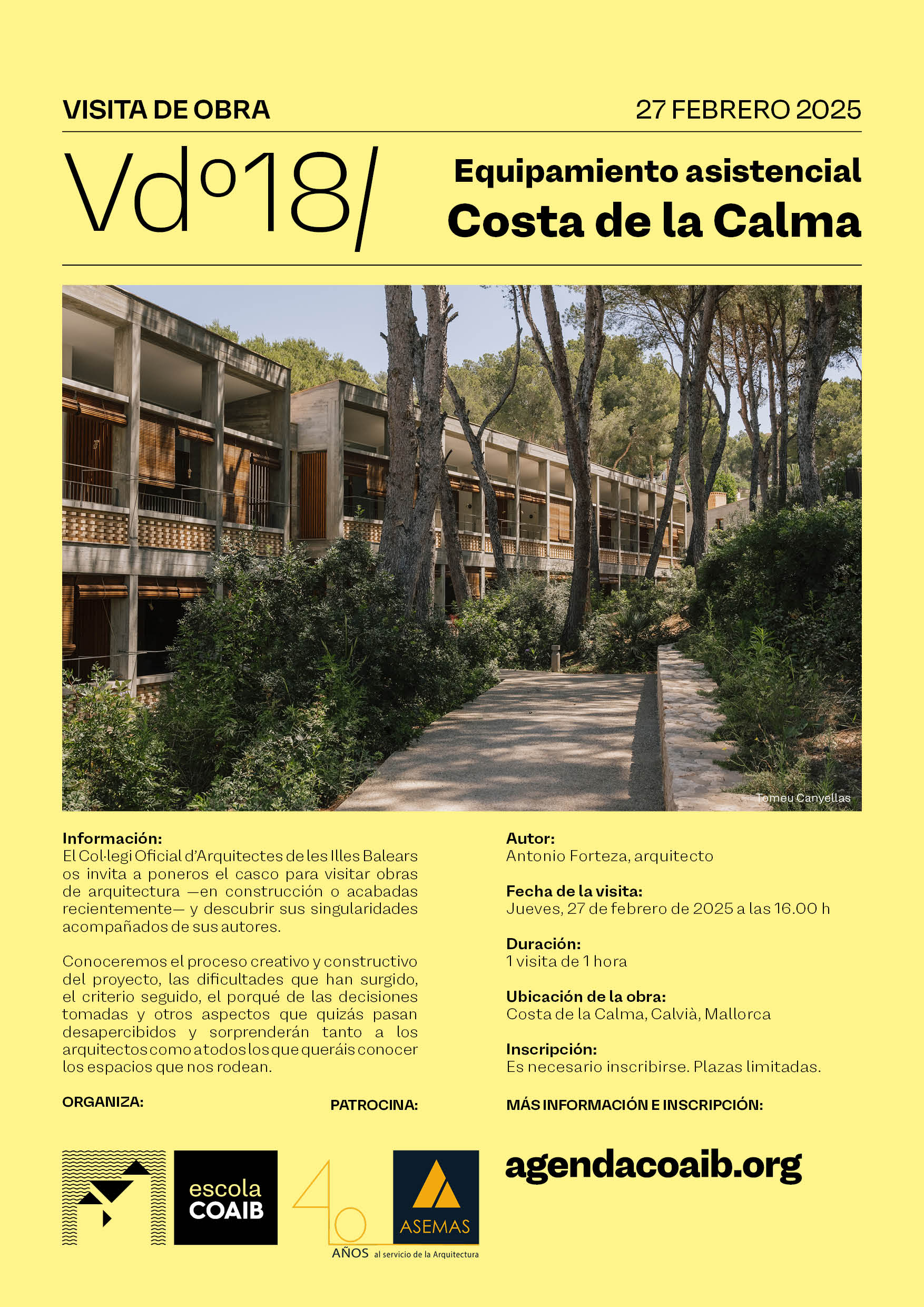En esta ocasión conoceremos el proceso creativo y constructivo de este equipamiento asistencial en la Costa de la Calma, obra del arquitecto Antonio Forteza, con quien descubriremos las dificultades que han surgido, el criterio seguido, el porqué de las decisiones tomadas y otros aspectos que quizás pasan desapercibidos y sorprenderán tanto a los arquitectos como a todos los que queráis conocer los espacios que nos rodean.