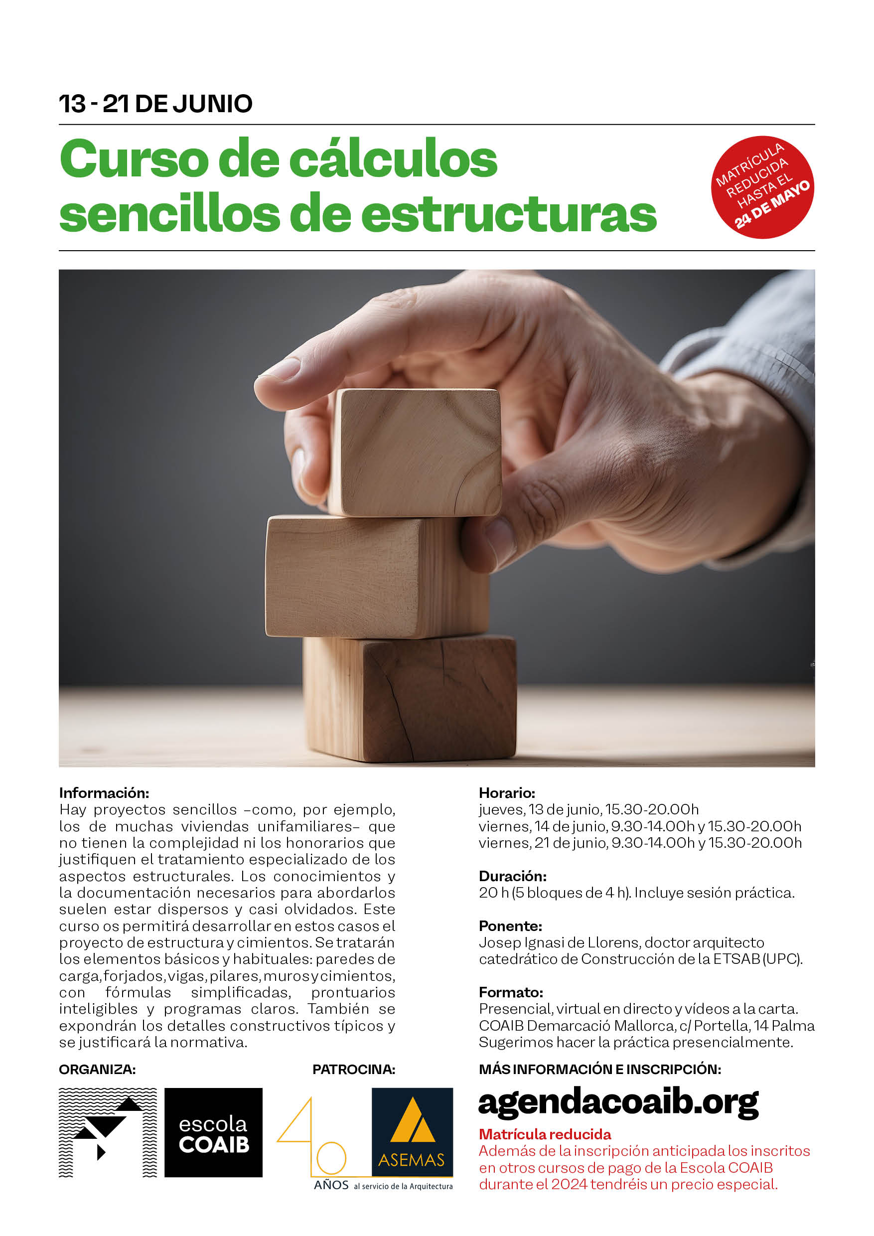 Este curso de cálculos sencillos os dará los conocimientos necesarios para desarrollar en estos casos el proyecto de la estructura y los cimientos. Se tratarán los elementos básicos y habituales: paredes de carga, forjados, vigas, pilares, muros y cimientos, con fórmulas simplificadas, prontuarios inteligibles y programas claros. También se expondrán los detalles constructivos típicos y se justificará el cumplimiento de la normativa actual, considerando el "Código Estructural".
