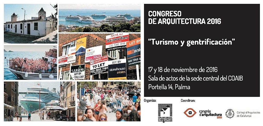 El Col·legi Oficial d’Arquitectes de les Illes Balears organiza el próximo jueves 17 y viernes 18 de noviembre el Congreso de Arquitectura: "Turismo y gentrificación", que se celebrará en el salón de actos de la entidad colegial con objeto de analizar y debatir los actuales procesos de transformación sociales y económicos en ciudades turísticas.