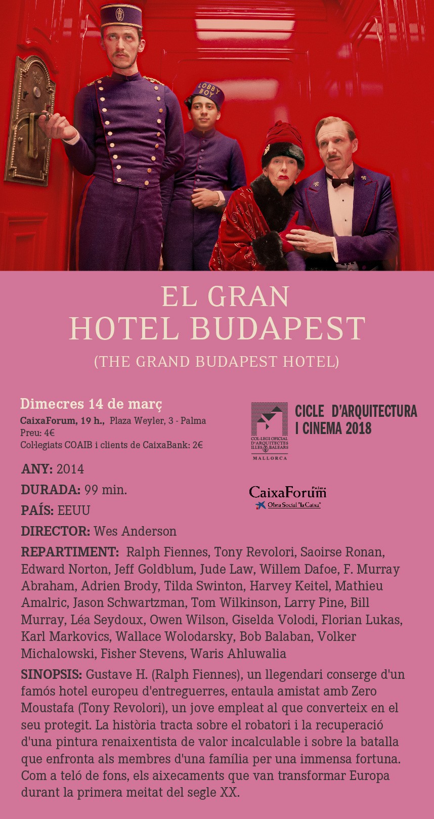 Ciclo 2018 “Ciclo de arquitectura y cine”. Periodicidad mensual. El gran hotel Budapest (The Grand Budapest Hotel). CaixaForum, miércoles 14 de marzo de 2018.