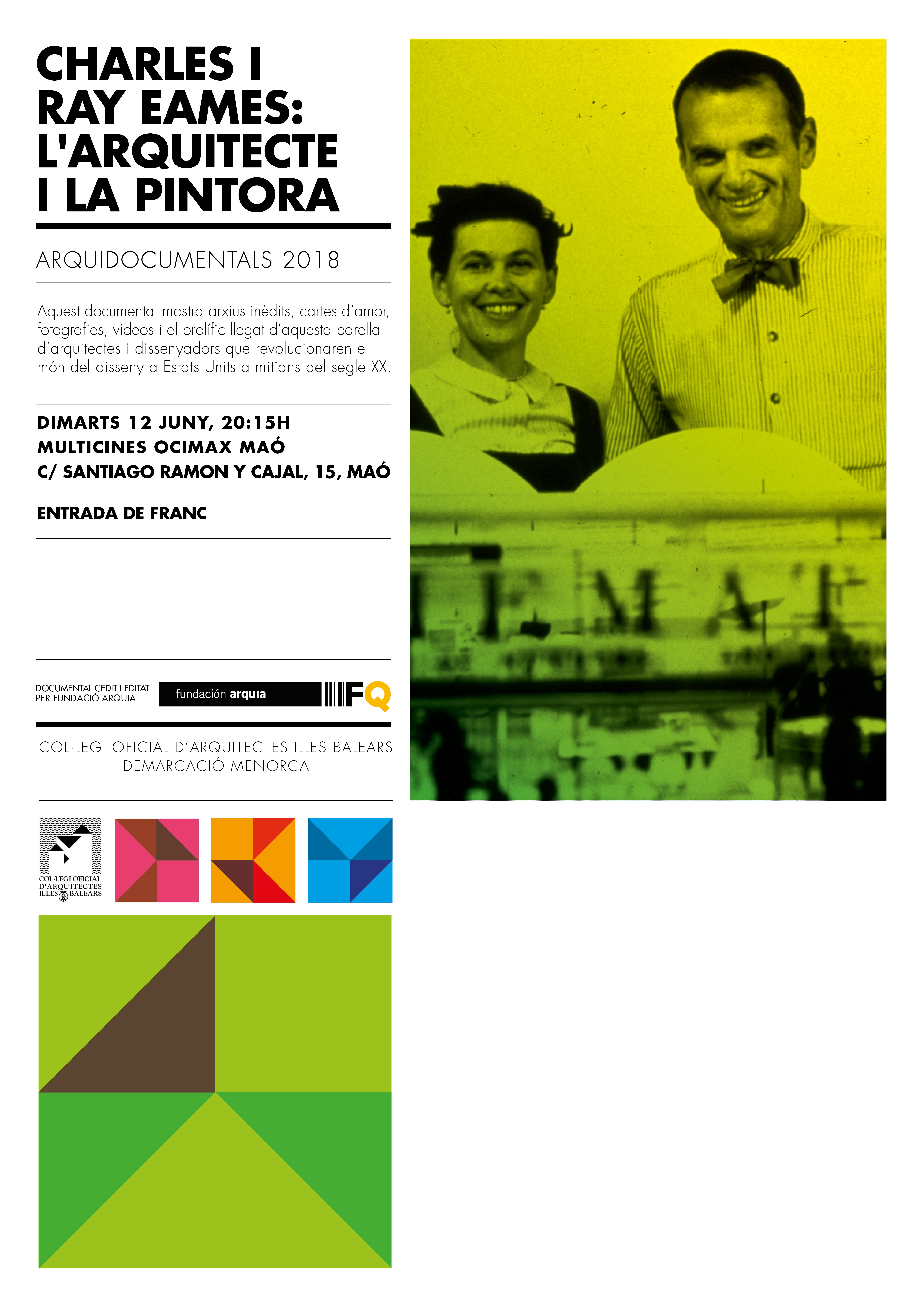 La vocalía de Cultura de la Demarcación Menorca del COAIB, con motivo del ciclo “Cinema i Arquitectura” organiza la proyección del documental CHARLES Y RAY EAMES: EL ARQUITECTO Y LA PINTORA que se celebrará el 12 de junio en el Multisalas Ocimax Maó y que en este ciclo se abre a un público más amplio.