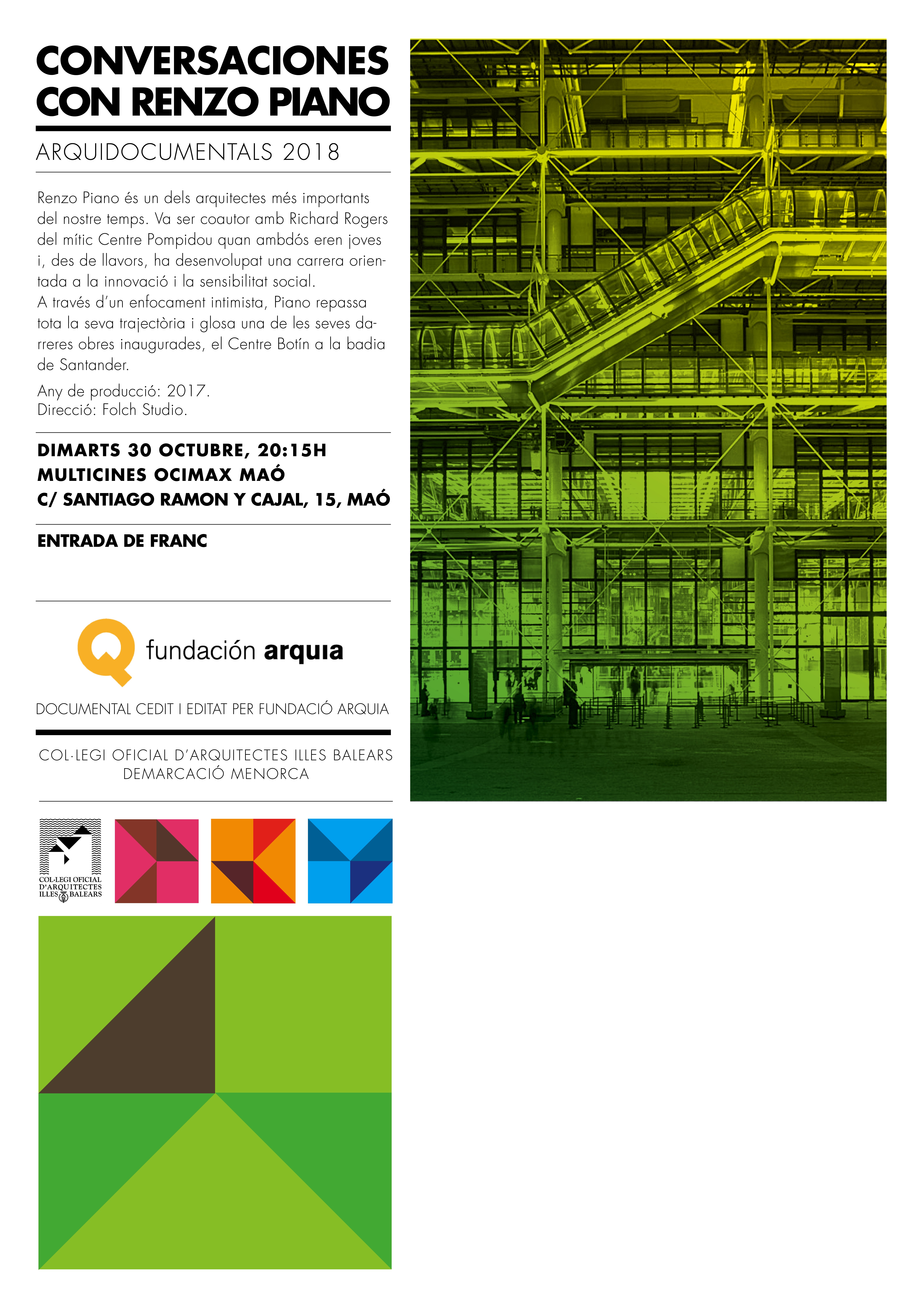 La vocalía de Cultura de la Demarcación Menorca del COAIB, con motivo del ciclo Cine y Arquitectura organiza la proyección del documental Conversaciones con Renzo Piano cedido y editado port per la Fundación Arquia, que se celebrará el 30 de octubre en el Multisalas Ocimax Maó y que en este ciclo se abre a un público más amplio.