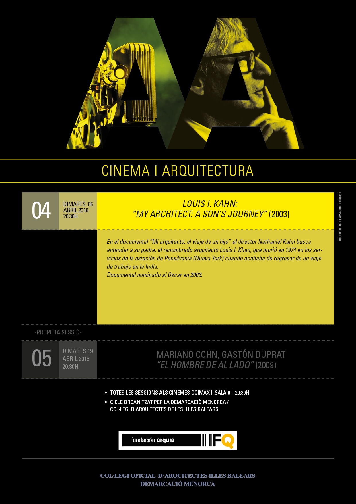 La Vocalía de Cultura de la Demarcación Menorca del COAIB, con motivo del ciclo “Cinema i Arquitectura” organiza la proyección del documental: Louis I. Khan: My architect que se celebrará el 5 de abril de 2016 en el Multisalas Ocimax Maó y que en este ciclo se abre a un público más amplio.