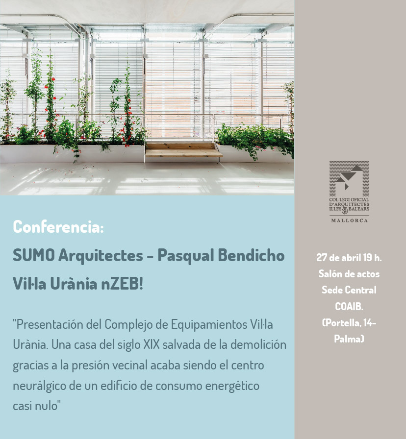 La Demarcación Mallorca del COAIB organiza la conferencia Vil·la Urània nZEB! a cargo de Pasqual Bendicho de SUMO Arquitectes que presentará el Complejo de Equipamientos Vil·la Urània. Una casa del siglo XIX salvada de la demolición gracias a la presión vecinal y que acaba siendo el centro neurálgico de un edificio de consumo energético casi nulo.