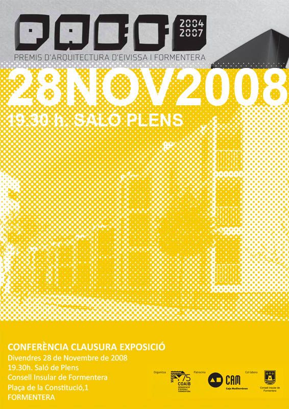 El President de la Demarcación de Eivissa i Formentera del COAIB se complace en invitarlos a la conferencia de clausura de la exposició en Formentera de la 5a edición de los Premios de Arquitectura d'Eivissa i Formentera 2004-2007, que se celebrará el Viernes 28 de noviembre de 2009, a las 19,30 hores.